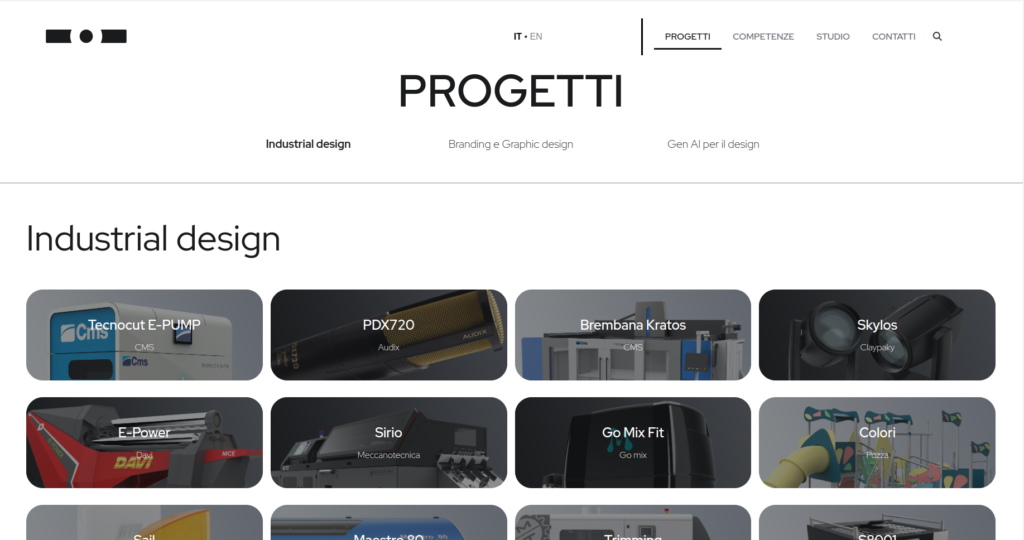 Il sito offre una panoramica dei progetti realizzati per clienti diversi, mostrando esempi concreti di design applicato in vari settori, da prodotti tecnologici all’illuminazione professionale, fino a macchinari industriali. Questa sezione è utile per comprendere la varietà e l’esperienza dello studio nella realizzazione di soluzioni su misura.