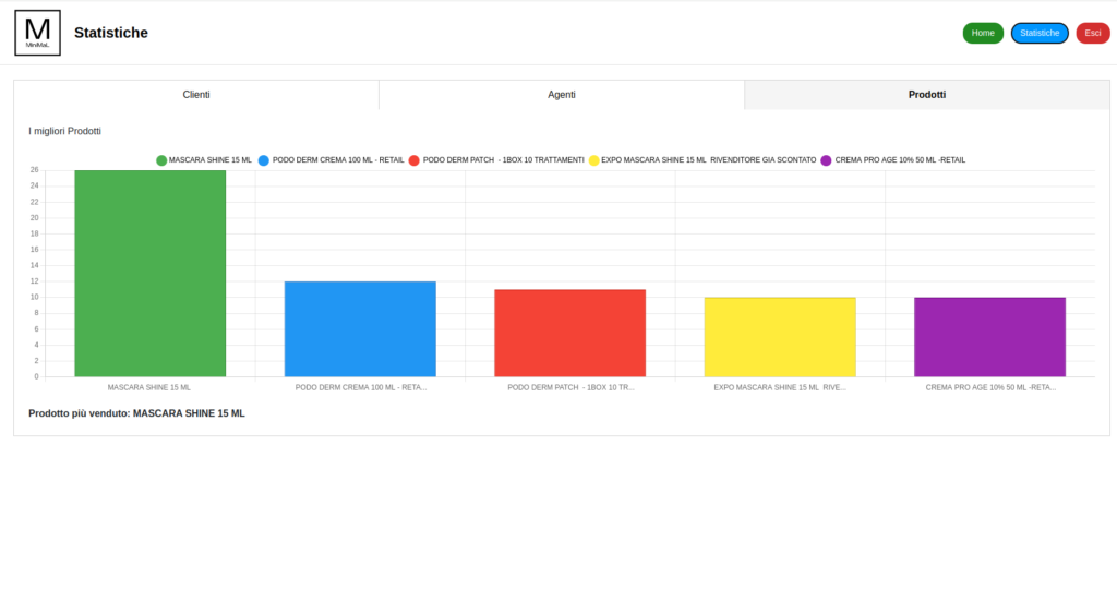 All’interno del programma è presente anche una sezione dedicata alle statistiche tramite dei grafici molto intuitivi che permettono all’operatore di poter vedere facilmente gli andamenti degli affari. In questa pagina, infatti, è possibile vedere i prodotti più venduti, gli agenti che seguono più clienti e i clienti che hanno effettuato più ordini. In questo modo, l’admin può monitorare su tutto in modo rapido e sa dove deve intervenire per correggere eventuali situazioni non ottimali.