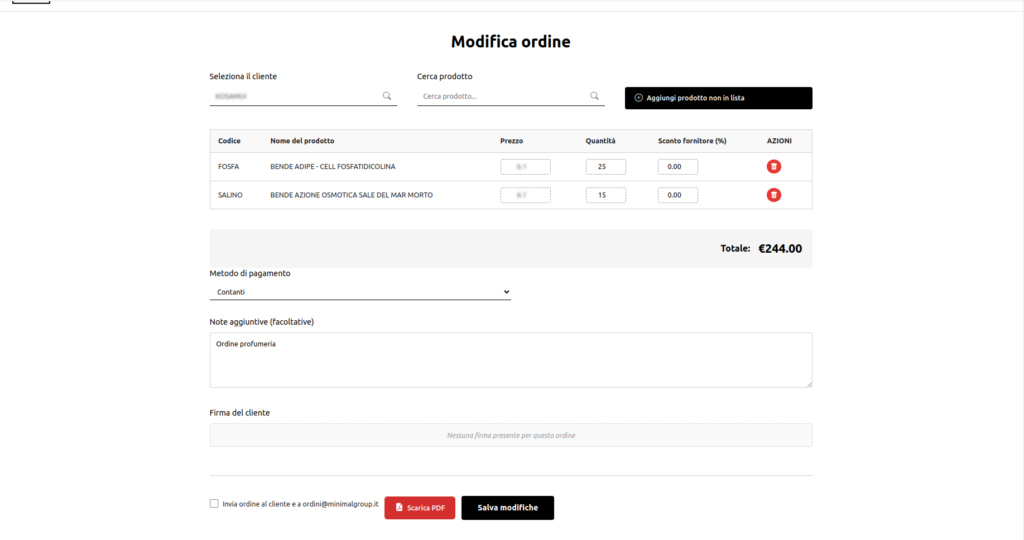 Il punto forte di questo programma è la possibilità, una volta creato un ordine o un preventivo, di poter generare e visualizzare istantaneamente il file PDF che contiene tutti i dati necessari di tutti i prodotti e di tutte le figure che sono coinvolte. È subito pronto per essere inviato al cliente e registrato presso il database principale. È, inoltre, possibile anche registrare la firma digitale di chi conferma l’ordine che è stato creato, consentendo una gestione dei documenti estremamente più efficiente ed organizzata che va a sostituire l’obsoleto e lento metodo di scambio di informazioni tramite WhatsApp.