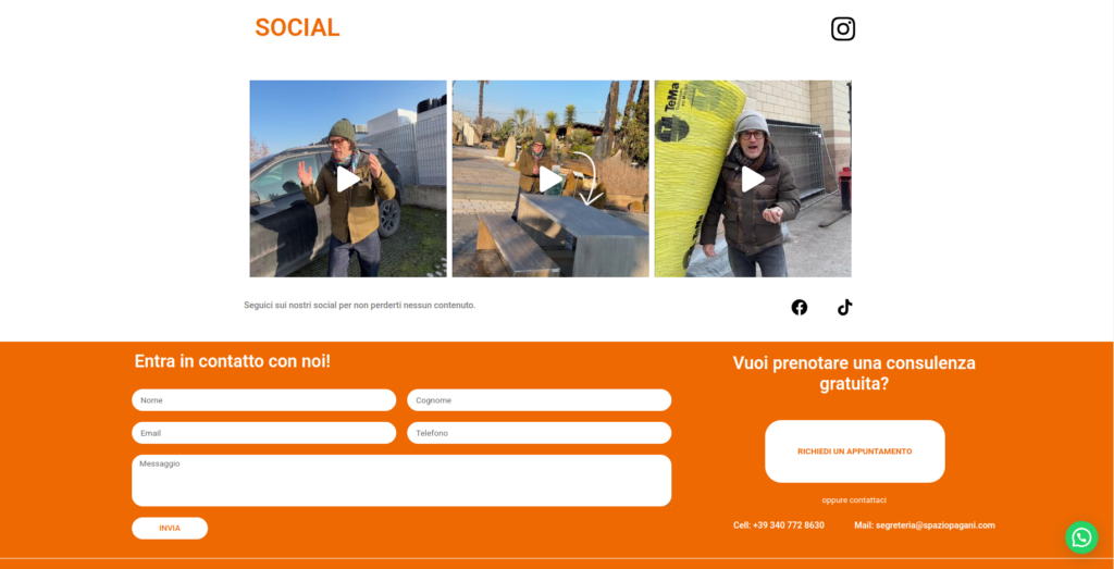 La struttura del sito è semplice e orientata alla navigazione pratica: Menu principale con sezioni come Chi siamo, Il nostro team, Prodotti, I nostri clienti e Social; Contenuti visuali che mostrano esempi di materiali, soluzioni tecniche o immagini correlate ai prodotti; Moduli di contatto e riferimenti diretti per comunicare con l’azienda (numero di telefono, email, richiesta di appuntamento). Questa struttura indica che fin dall’inizio l’obiettivo è stato quello di favorire un contatto rapido con l’utente e fornire informazioni utili in pochi passaggi.